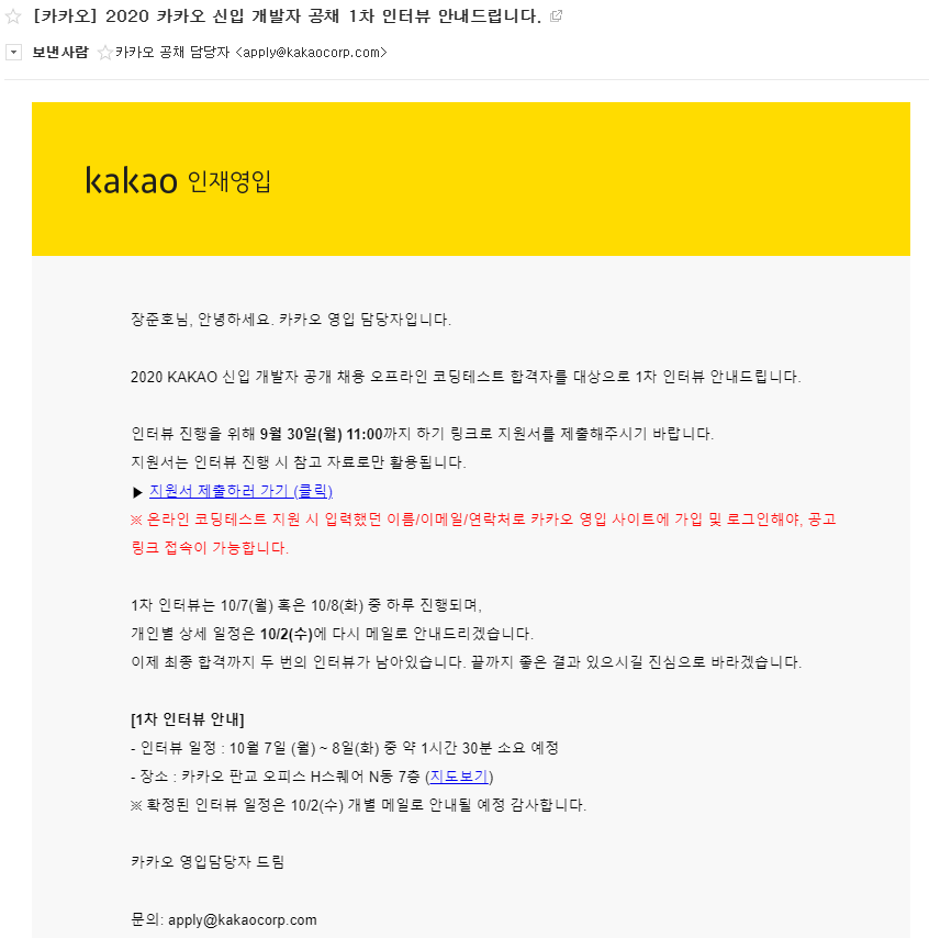 | 2020 카카오 신입 개발자 공채 1차 면접 후기 및 결과 (4) | 2019.10.11 |