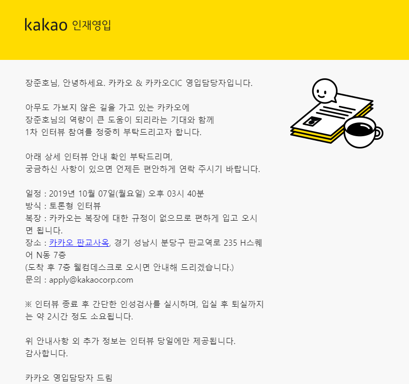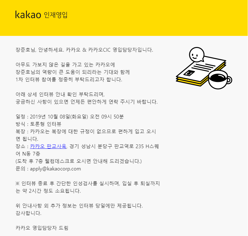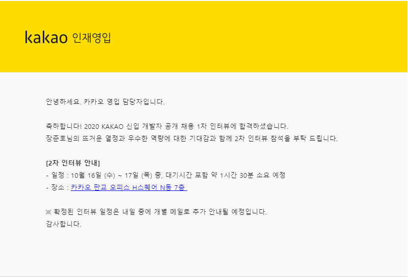 1차 면접의 경우 이틀에 나누어서 진행되었으며 개인 별로 면접 일정을 메일로 알려주었습니다. 원래는 월요일 3시 45분으로 잡혀 있어 수업시간으로 인해 참석하기 어려웠었습니다. 내년을 기약해야겠다고 생각하고 불참 메일을 보냈었는데, 카카오에서 전화로 연락이 와서 면접 시간을 바꿀 수 있었습니다. 면접 장소는 판교에 있는 카카오 회사에서 진행되었습니다.