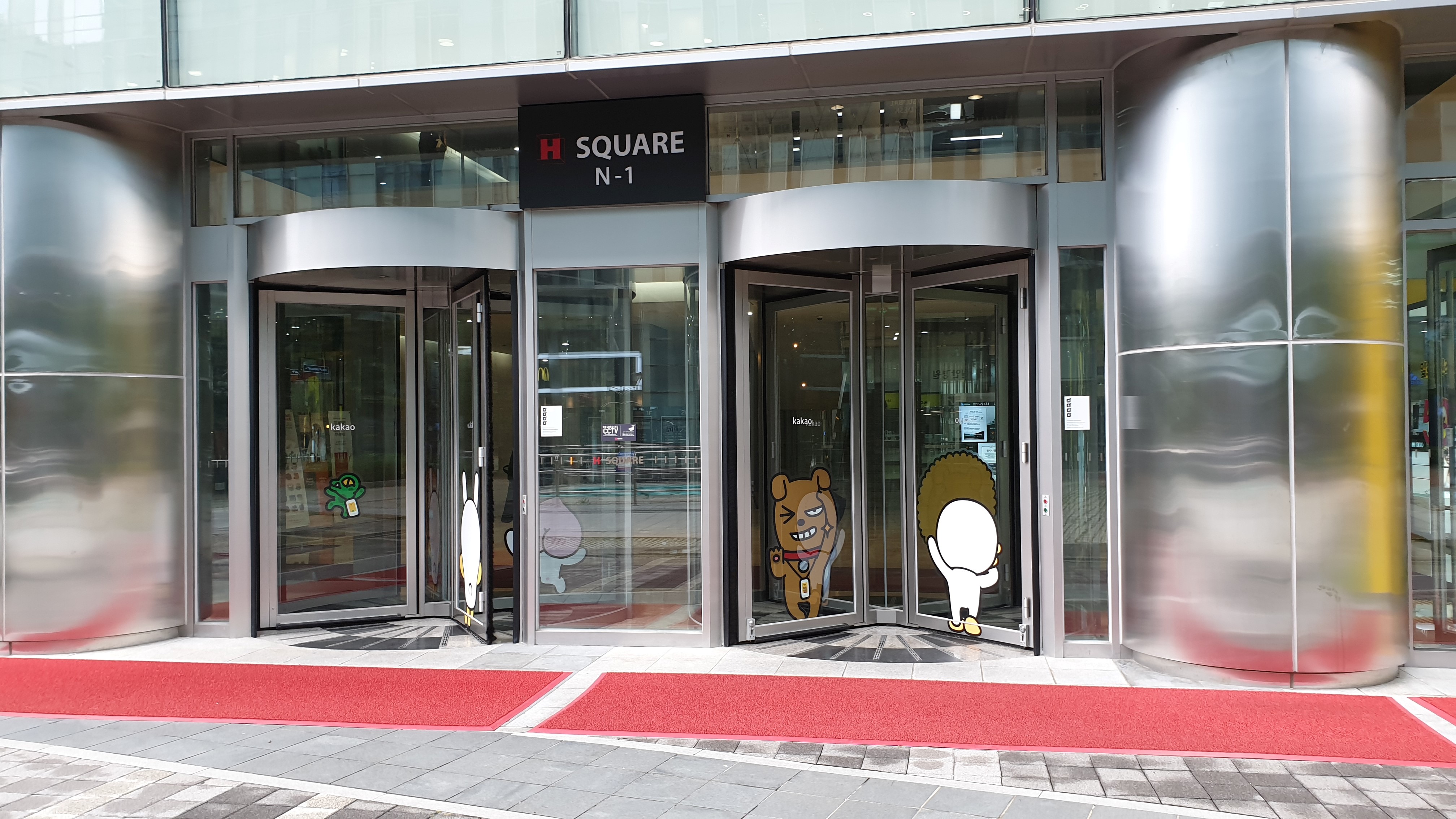 카카오에 가보니 회전문에 카카오의 캐릭터가 그려진 것을 볼 수 있었습니다. Nexon과 NHN과 같은 회사는 건물에 회사 로고를 표시해놓은 것과는 달랐습니다. (물론 제가 로고를 찾지 못했던 것일 수도 있습니다.)