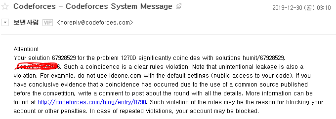 요약하면 1. 내가 제출한 코드가 다른 사람이 제출한 코드와 완벽하게 일치한다. 2. 이는 규정 위반이며, 의도하지 않았더라도 문제가 있다. 는 내용이었다.